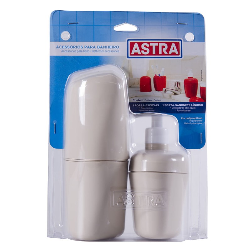 Organize e decore sua bancada com o kit da Astra, que acompanha um porta-sabonete líquido com válvula pump e porta-escova de dente com tampa que dão um toque de harmonia ao ambiente. Uma solução higiênica e funcional. Possui um design robusto e estiloso, deixando o lavabo mais bonito e organizado. Perfeito para facilitar o dia a dia.