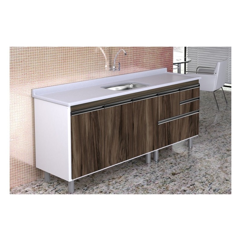 A caixa do gabinete é no estilo “sanduíche” com estrutura feita com madeira de reflorestamento próprio tratada em estufas com alta temperatura. Frente de portas e gavetas em MDP BP – 15mm madeirado com lâmina melamínico, proporcionando maior resistência luz, à umidade e fácil limpeza. Corrediças telescópicas e portas com dobradiças hidráulicas com click, reforçadas proporcionando abertura suave e completa das portas e gavetas, gaveta superior com porta talheres, puxadores em perfil de alumínio e pés ABS com fixação de rosca.
