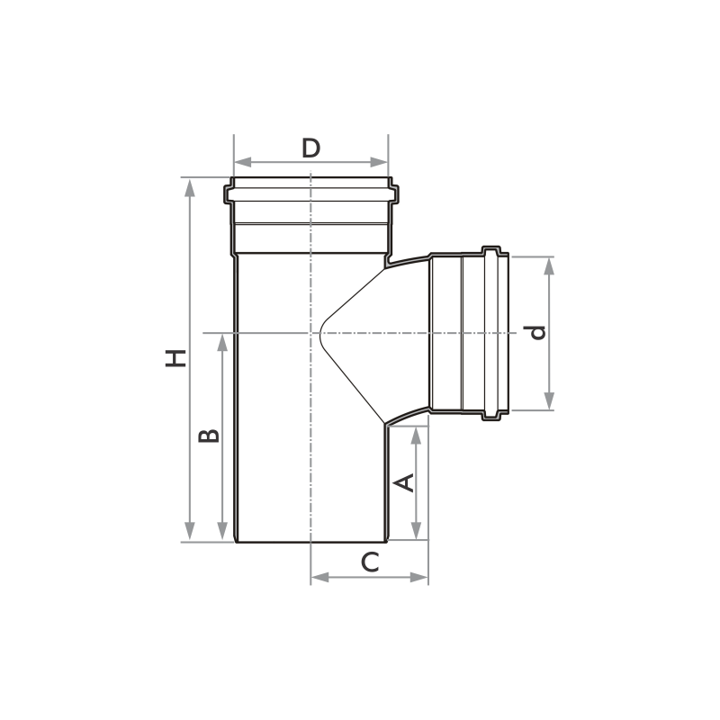 TE ESGOTO SN 150X150MM FORTLEV| Dimensões (mm) | A | B | C | D | d | H | ||
