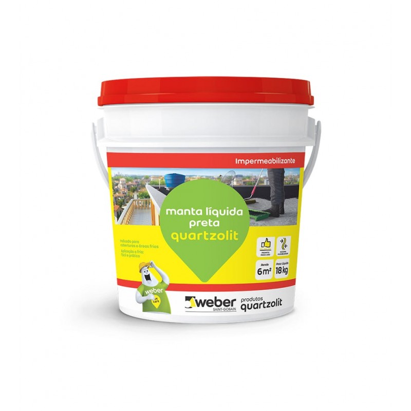 Manta líquida preta Quartzolit é uma membrana asfáltica para a impermeabilização de superfícies, como concreto, argamassa, alvenaria, superfícies metálicas e madeira.Pode ser utilizado para a impermeabilização de lajes de coberturas, impermeabilização de substratos cimentícios em áreas molhadas, como banheiros, cozinhas e áreas de serviço.