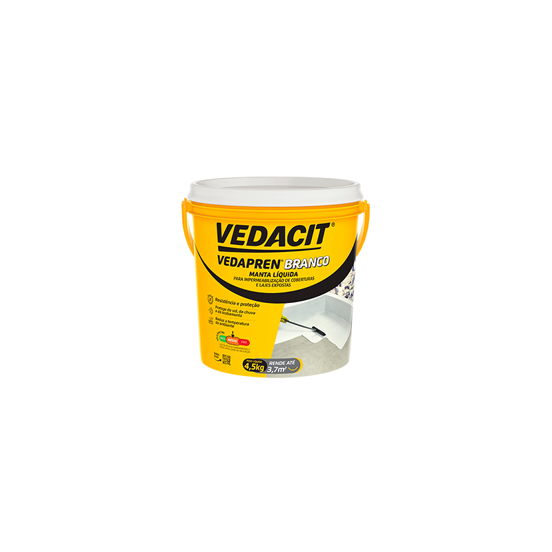 VEDAPREN BRANCO MANTA LIQUIDA 04,5KG VEDACITProporciona excelente acabamento, além de refletir os raios solares, o que reduz parte do calor absorvido pela estrutura. VEDACIT VEDAPREN BRANCO dispensa proteção contra os raios solares.