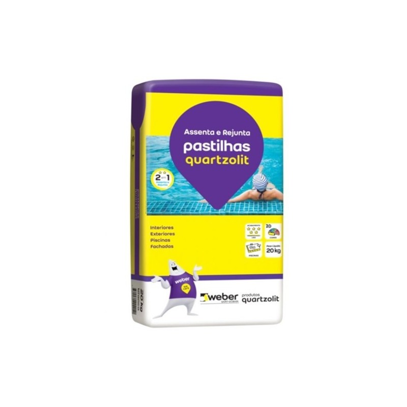 Argamassa especial para assentamento e rejunte simultâneos de pastilhas em áreas externas e internas, piscinas e fachadas, acabamento liso.